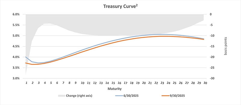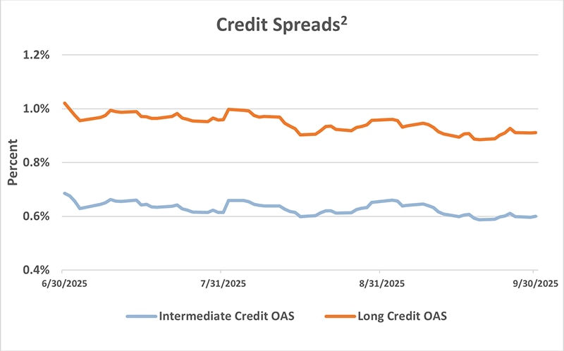 During the quarter, the Treasury curve continued to steepen with rates decreasing along the short end and the long end of the yield curve. The short end of the curve decreased approximately 4-28 basis points (bps), while the long end of the curve decreased more modestly, approximately 3-10 bps. The Federal Reserve reduced the federal funds rate by 25 bps in September, which directly impacted the short end of the curve. In isolation, the change in Treasury yields increased the liability and caused a decrease in funded ratios for return driven pension plans and a small decrease in funded ratios for liability driven plans.