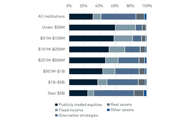 Asset allocation is widely recognized as the key driver of investment returns, with the primary purpose of an endowment portfolio being to seek return while reducing risk. The risk associated with long-term volatility in financial markets can be mitigated by the diversification of assets. Across all size cohorts, a multi-asset class strategy can be used year after year with few adjustments required.