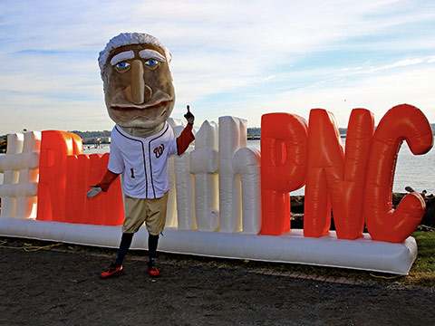 George Washington (courtesy of the Nationals) made a special appearance at the PNC Parkway Classic in November. Here, the Run with PNC inflatable was placed on the shores of the Potomac River.