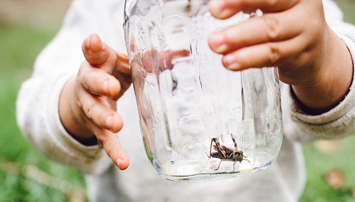 - Tell the children they will be keeping the crickets for a few days. Assist the children with placing leaves, twigs, grass, a cotton ball, and some food into the jars with the crickets.