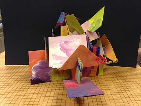 6. Demonstrate how to use the painted shapes to make a sculpture by interlocking the base pieces to form an X. Allow the class to direct the placement of the smaller pieces on the base; emphasize directional words—such as beside, above, below, to the left, to the right—as you place each piece.