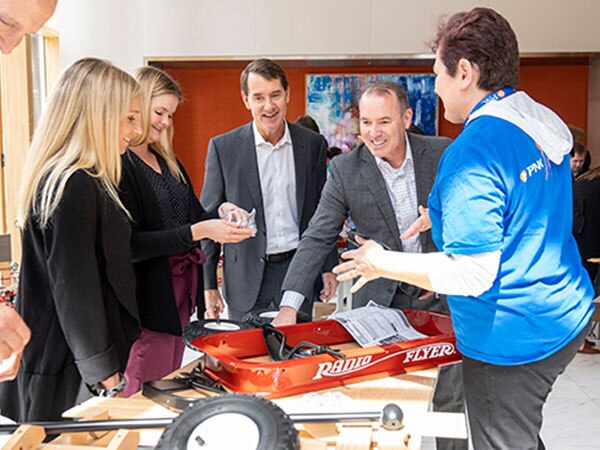 CEO Bill Demchak, center, stops in on one of the many sessions of trikes and wagons being built by PNC volunteers to kick off Great Month.