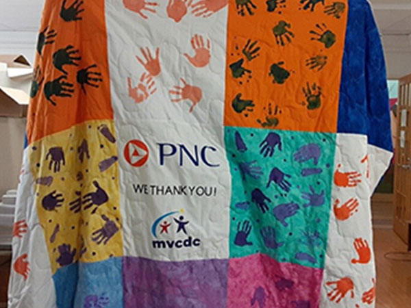 This quilt, made by the education coach at Marilyn E. Thomas Early Education Center in Trotwood, Ohio, is a thank you to PNC and volunteers for their ongoing support.