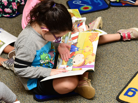 An engrossed young reader follows along in her own copy of the book, based on the Emmy Award-winning, animated preschool series from Fred Rogers Productions.
