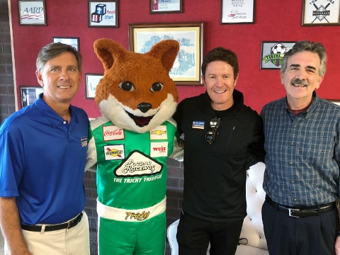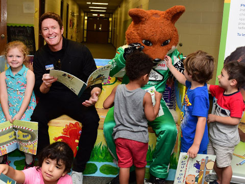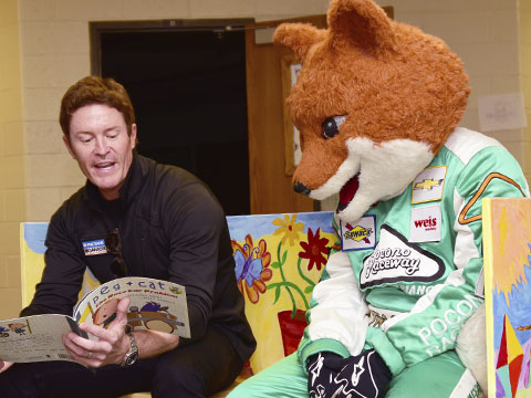 Before the race at Pocono Raceway, Scott Dixon and Tricky, the raceway mascot, stop by The Mountain Center to read Peg + Cat: The Race Car Problem.