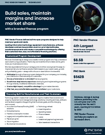 Many of the world’s leading tech companies count on PNC Vendor Finance to provide the innovative finance solutions needed to connect them with businesses and industries that want their products to stay competitive.