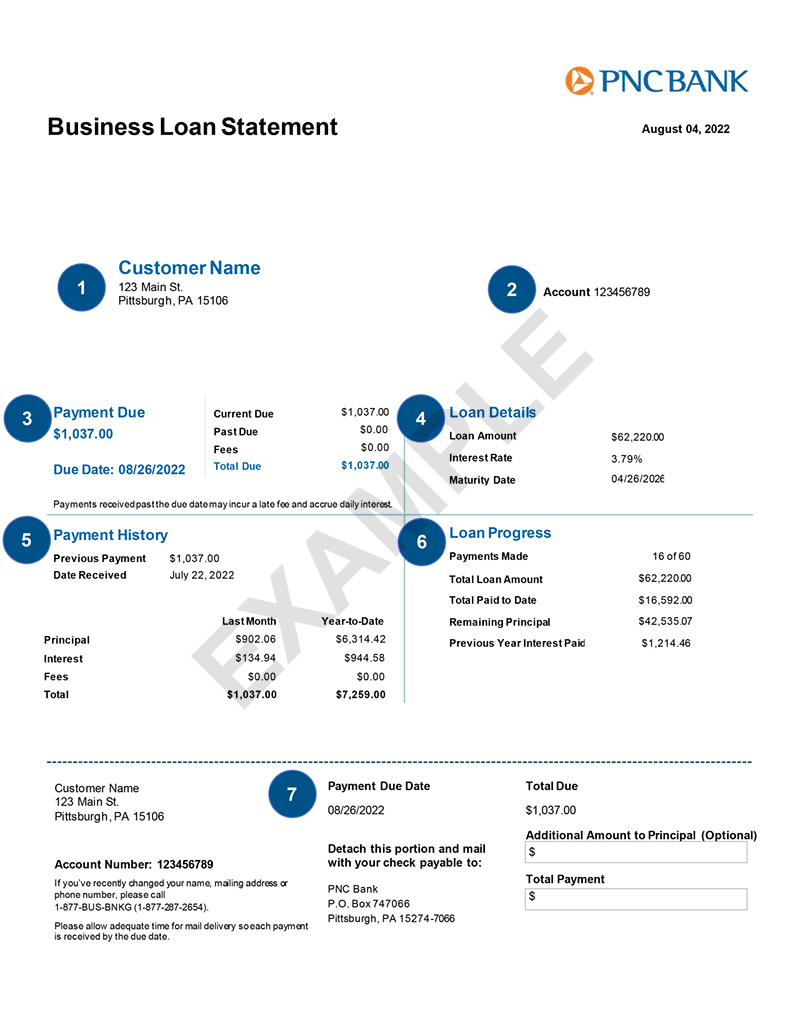 This section can be used as a payment remittance slip to send with a check when making a loan payment by mail. If your business loan is set-up for automated payments, you will see this message on the remittance slip: "This is not a bill. Your current payment amount will be automatically deducted from your deposit account on the payment due date."