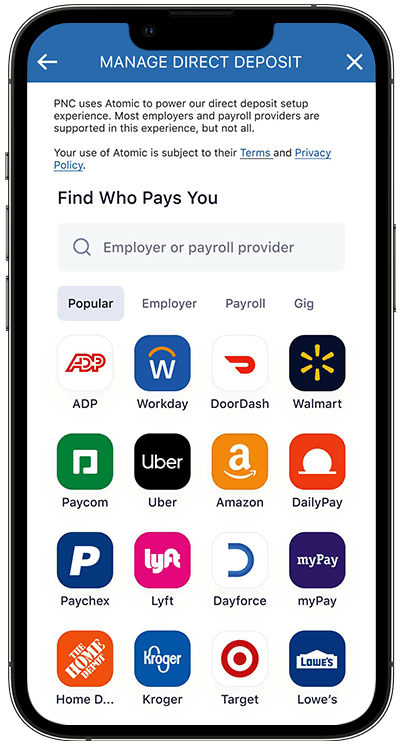 There are thousands of employers supporting close to 80% of payees in the United States. If you can’t find your employer or payroll provider, you can submit a copy of the PDF form on pnc.com to your employer for processing.