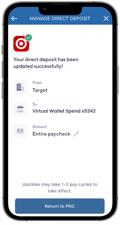 Once it’s set up, you can also manage your direct deposit however works for you. Split your funds between PNC accounts, add gig economy jobs, and change your allocations anytime.