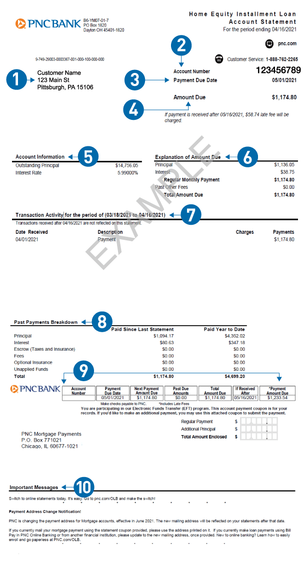 Billing Statement Payment Information: This section identifies what you must pay and by what date to avoid late fees. When paying with a check, this section should be removed and used as a payment coupon returned with your check. The account used for payment via Electronic Funds Transfer (EFT) will not be identified.