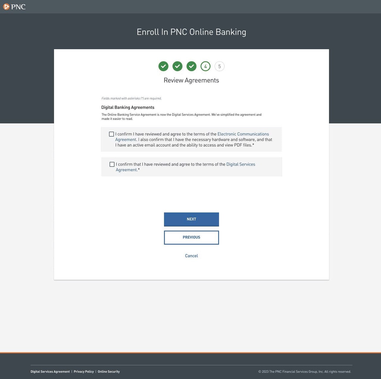 - Check boxes to agree to PNC's Digital Banking Agreements.