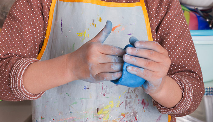 - Muestre cómo amasar la arcilla hasta que se ablande y pídales a los niños que hagan lo mismo con sus piezas de arcilla.