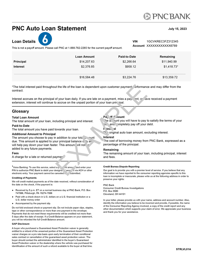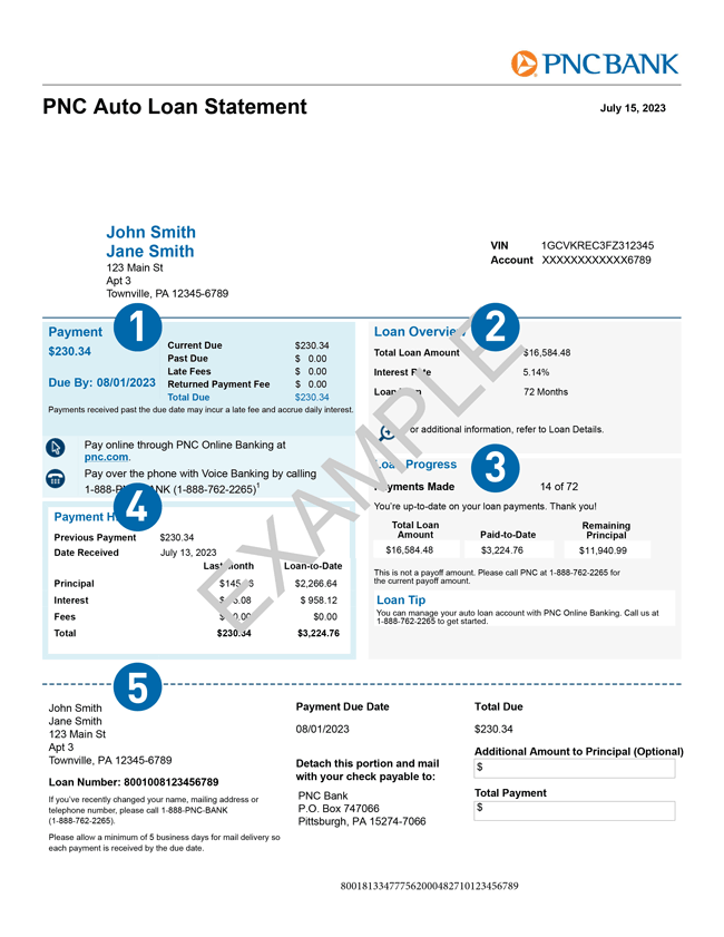 El pago refleja el monto actualmente adeudado en su préstamo para vehículo de PNC. Usted tiene la responsabilidad de pagar este monto en la fecha de vencimiento especificada.