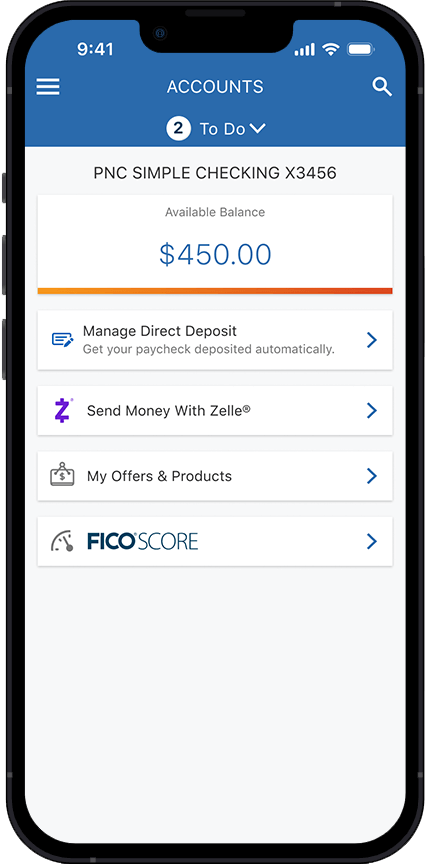 Zelle® es fácil de usar en la aplicación de la banca móvil PNC Mobile y se conecta directamente con su cuenta.[6]
