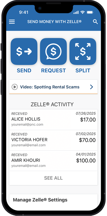Zelle® es fácil de usar en la aplicación de la banca móvil PNC Mobile y se conecta directamente con su cuenta.