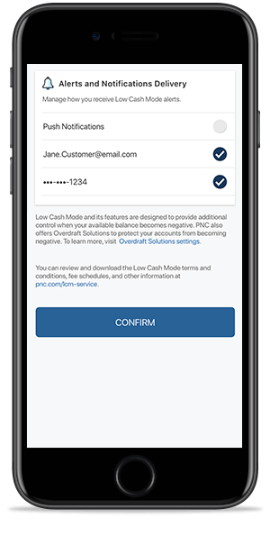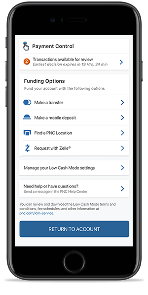 En este momento, Low Cash Mode solo está disponible en la aplicación de la banca móvil PNC Mobile. Para obtener más información sobre cómo descargar la aplicación de la banca móvil PNC Mobile, visite www.pnc.com/mobile.