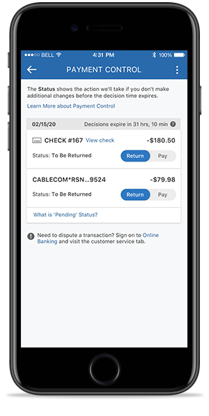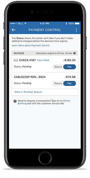 Únicamente los cheques y las operaciones de la Cámara de Compensación Automatizada (ACH) realizadas usando su número de cuenta y de ruta estarán disponibles en Control de pagos. Las transacciones con tarjeta de débito no son elegibles para Control de pagos.