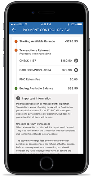 Cuando decide devolver un artículo que ha sido presentado a PNC para pago, devolveremos el artículo al banco del beneficiario por concepto de fondos insuficientes, y el beneficiario no recibirá el pago de parte de PNC. Es posible que aún tenga la obligación de pagar al beneficiario por los bienes, servicios u otros productos. PNC no tiene la responsabilidad de satisfacer obligación alguna entre el cliente y el beneficiario o cualquier otra parte con respecto a un artículo que usted decida devolver. Antes de tomar la decisión de devolver un artículo, debe considerar las reglas que pueda tener el beneficiario, o las medidas que el beneficiario pueda implementar con respecto a los pagos atrasados o devueltos.