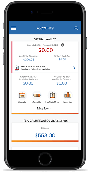 Su cuenta Spend de Virtual Wallet ahora incluye Low Cash Mode, que envía alertas inteligentes en tiempo real, las cuales le avisan cuando su saldo es bajo, le permite decidir si ciertas transacciones[1] se deben pagar o devolver cuando su saldo es negativo, y le ofrece por lo menos 24 horas para sacar su cuenta del saldo negativo para que pueda evitar los cargos por sobregiro.