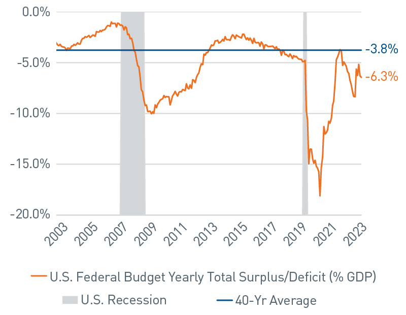 As we get closer to Election Day and the January 2025 debt ceiling expiration, we expect more noise related to the debt and deficit; however, we believe any effects will be short-lived. As our investment process is biased toward long-term investment horizons, the U.S. deficit and debt balance have yet to influence our asset allocation positioning.