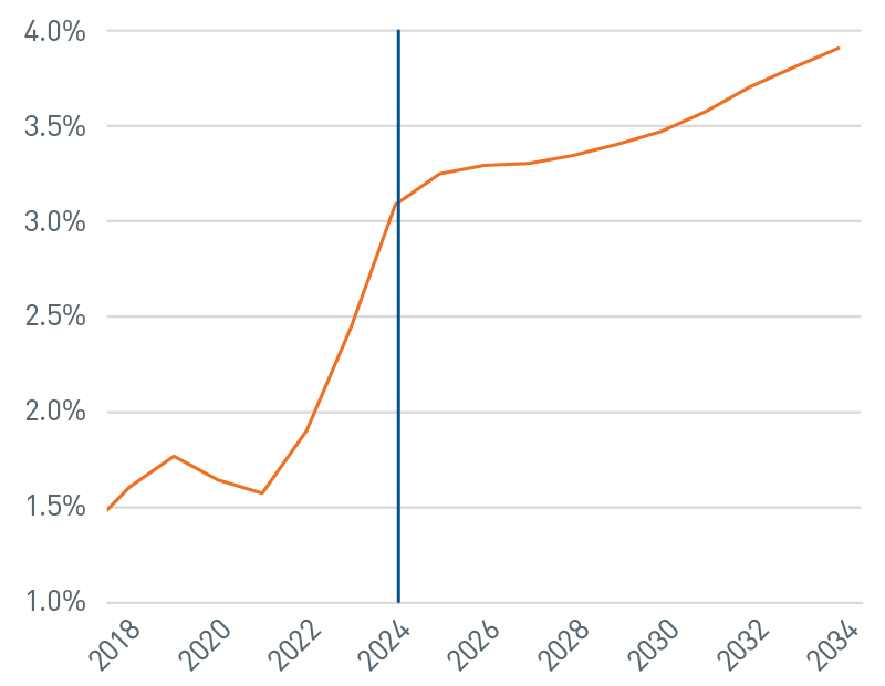 According to the Congressional Budget Office (CBO), the deficit will grow from an equivalent of 5.6% of GDP in 2024 to 6.1% in 2034 (Figure 1). Furthermore, federal debt levels are expected to climb from 99% of GDP to 116% over that same period. There are myriad causes of these sizeable balances, but the effects of government intervention during the global financial crisis and COVID-19 pandemic exacerbated their growth trajectory.