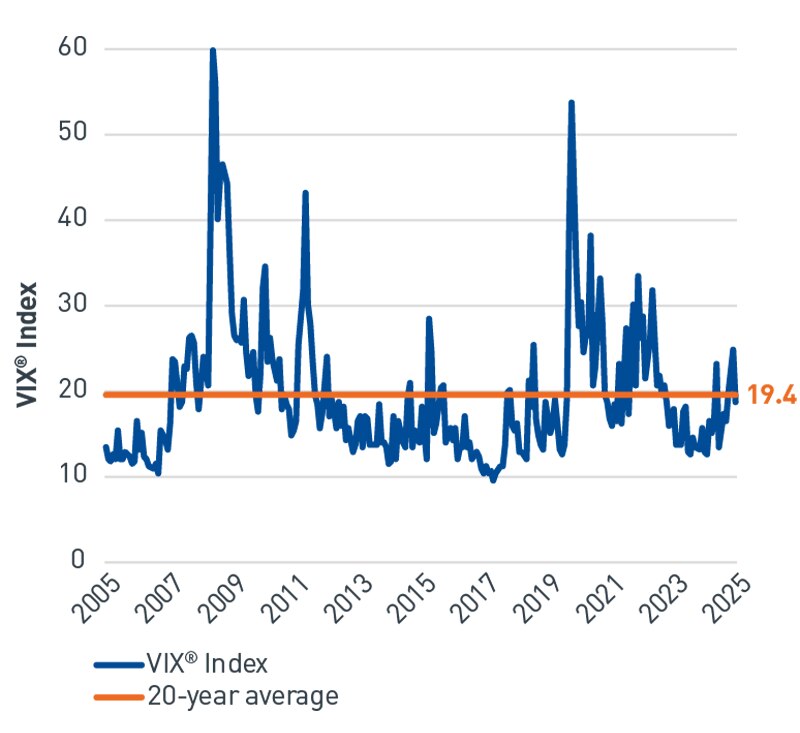 In November, global equities finished mostly flat after reversing a mid-month pullback. The S&P 500® managed to end the month with a 0.1% return, after being down by 4.5% mid-month, and marked its seventh consecutive positive monthly return. Artificial intelligence (AI)-related growth stocks were the laggards of the month as the Nasdaq Composite and MSCI Emerging Market indices posted negative returns, tempering this year’s outperformance by global AI companies. Speculation about Federal Reserve interest rate policy moved markets in November, playing a role in both the pullback and subsequent rebound. There were significant fluctuations in the fed funds futures pricing tied to a December rate cut; the month began with a more than 90% likelihood, then fell as low as 30%, before rebounding to levels of near certainty (Figure 1). Likewise, investor sentiment oscillated during the month around hopes for a rate cut and sentiment about AI.