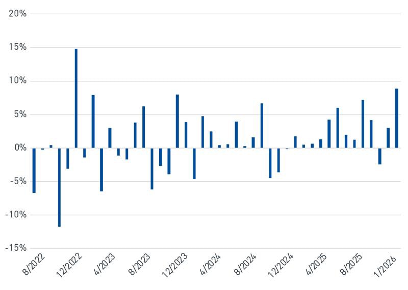 Global markets began 2026 with broad, positive momentum across major asset classes. U.S. equities posted modest gains, led by small-capitalization (cap) equities. International equities outperformed U.S. large cap, aided by a weaker U.S. dollar. Developed markets posted solid gains, while the MSCI Emerging Markets Index posted its best month in more than three years (Figure 1).