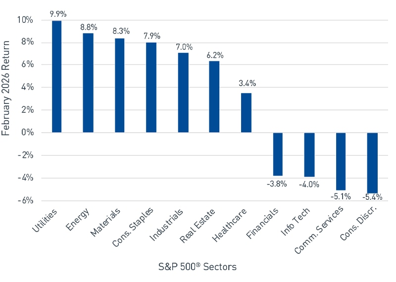 Global equity market performance diverged in February, extending this year’s cyclical rotation out of U.S. large-capitalization (cap) technology stocks, and into international and value equities. Artificial intelligence (AI) disruption concerns clouded the market, and the repricing of vulnerable industries led the Financials and technology-related sectors to underperform (Figure 1). As a result, the S&P 500® posted its first negative monthly return since April 2025.