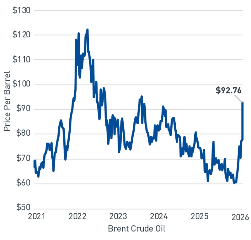 Given Iran’s geographic proximity to the Strait of Hormuz, a key maritime trade route through which 20% of the world’s oil and LNG trade passes through daily, the question of how long shipping will be disrupted, lingers. While oil prices thus far in early March have “only” risen back to 2024 levels (Figure 2), the tail risk of higher prices persists.
