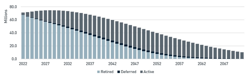A key risk management tool is de-risking with a custom liability-driven strategy, in particular one focused on cash flow matching. This approach aligns a portion of the plan assets — specifically investment grade bonds — with the timing and amount of expected retiree payments.Most Taft-Hartley pension plans are mature, with a large share of liabilities attributable to retirees already receiving benefits. These liabilities tend to have shorter maturities/durations and are therefore more efficient to hedge using a cash flow-matched fixed income strategy.