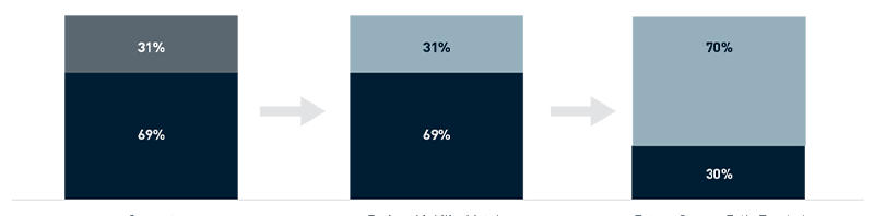 A reasonable target when the plan reaches full funding is to allocate enough to cover all retiree liabilities using a liability-matching strategy. For instance, the plan shown in Figure 3 that currently has 31% allocated to fixed income assets would shift the initial 31% to liability-matching strategy, and further move toward 70% liability match, corresponding to the share of liabilities for retirees in pay status as the plan ages. This strategy minimizes shortfall risk in the plan while preserving some exposure to growth assets to cover the longer-term liabilities of active participants.