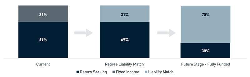A reasonable target when the plan reaches full funding is to allocate enough to cover all retiree liabilities using a liability-matching strategy. For instance, the plan shown in Figure 3 that currently has 31% allocated to fixed income assets would shift the initial 31% to liability-matching strategy, and further move toward 70% liability match, corresponding to the share of liabilities for retirees in pay status as the plan ages. This strategy minimizes shortfall risk in the plan while preserving some exposure to growth assets to cover the longer-term liabilities of active participants.