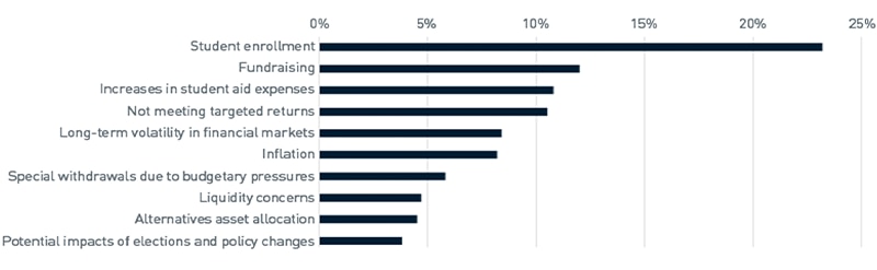 This year’s survey asked participants to identify their top two concerns. Their responses highlighted what is top of mind for higher education institutions and formed the basis of our annual key takeaways, constructed to provide insight and outline considerations for higher education leaders and trustees.