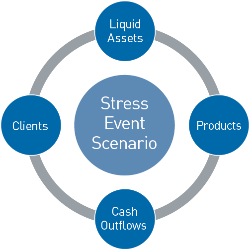 Envision a dot with Stress Event Scenario at the core. Around this dot is a circle that outlines the four main considerations of a Stress Event Scenario: Liquid Assets, Products, Cash Outflows, and Clients.