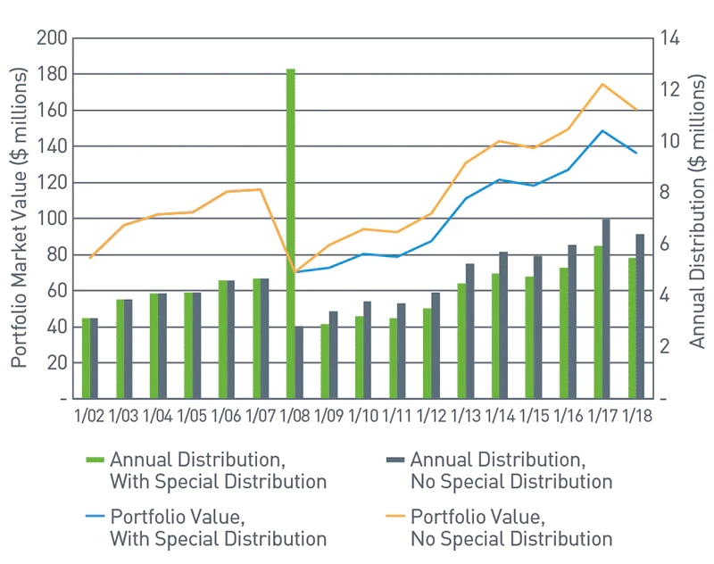 Aunque el análisis contenido en esta situación hipotética solo es teórico y está sujeto a los límites de nuestras suposiciones, una distribución especial podría tener profundas consecuencias en el valor de la cartera con el paso del tiempo, así como en la capacidad de la cartera para realizar contribuciones constantes para apoyar a una organización.