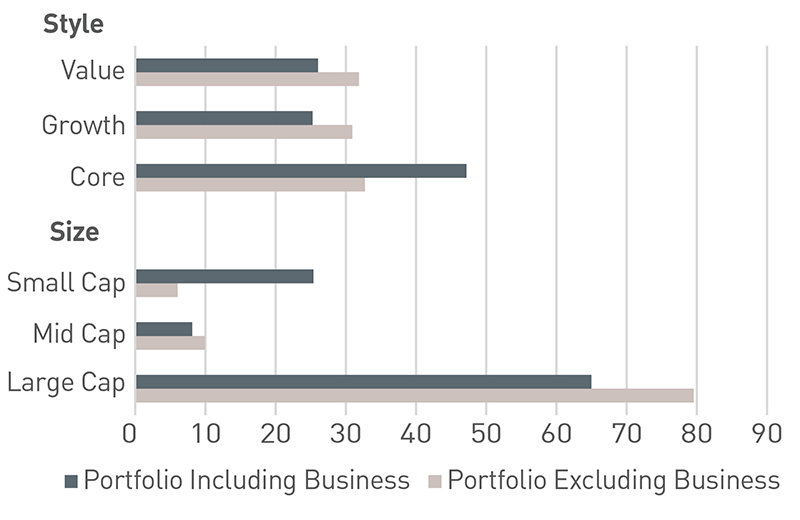 Tamaño/Estilo (Figura 1): Desde el punto de vista de la “Cartera que excluye negocios”, el inversionista parecería estar significativamente sobreponderado en capitales locales e infraponderado en capitales internacionales. Sin embargo, si se considera una “Cartera que incluye negocios”, la composición de la cartera cambia; tendría una sobreponderación significativa en el núcleo de pequeña capitalización internacional desarrollada. La construcción de una cartera de inversión que incluya toda la cartera financiera del inversionista (representada por la Cartera que incluye negocios) probablemente conllevaría un aumento de la exposición a los mercados internacionales desarrollados de gran capitalización y emergentes, una recomendación materialmente diferente que si no se tuviera en cuenta la participación empresarial.
