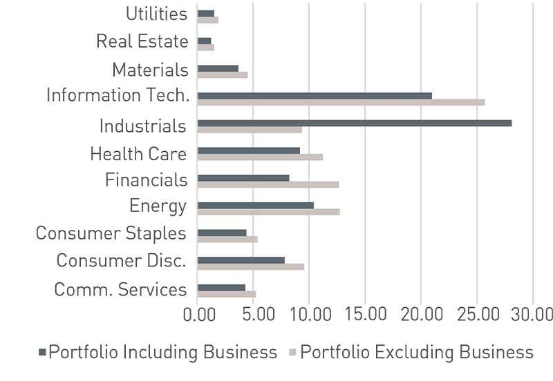 Sector/Industria (Figura 2): Nuevamente, al considerar únicamente la “Cartera que excluye negocios”, parece que la cartera está infraponderada en el sector industrial y sobreponderada en el sector tecnología y energía. Sin embargo, al incorporar la participación empresarial, la exposición de la cartera al sector industrial salta de equilibrada a una sobreponderación significativa. Así pues, la construcción de una cartera que incluya la participación empresarial implicaría evitar exposiciones adicionales a la industrial, la energía y la tecnología.