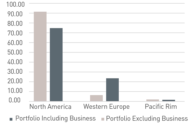 Domicilio (Figura 3): La incorporación de la exposición geográfica procedente de la participación empresarial reduce significativamente la sobreponderación en Norteamérica y hace que Europa Occidental pase de estar infraponderada a sobreponderada. La “Cartera que incluye negocios” ayuda a evitar la reducción de la exposición a Norteamérica y la adición a Europa Occidental.