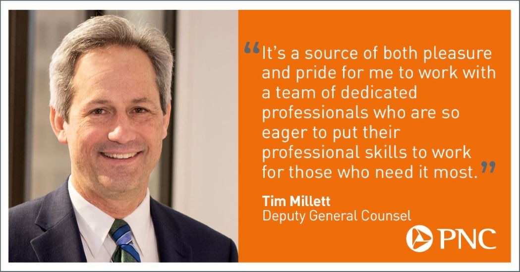 When I began my career at PNC, I discovered that many of my co-workers in the Legal Department were also passionate about pro bono work. Our volunteerism flourished when, under the leadership of then-new General Counsel Greg Jordan, our pro bono program was launched. Driven by the enthusiasm of our chief counsel for asset recovery, Mark Gittelman, PNC established a Pro Bono Council to encourage volunteer efforts and gauge suitability for proposed projects. The Council also came up with the idea to set aside a specific week each year for pro bono work; this year marks the 11th anniversary of that effort.
