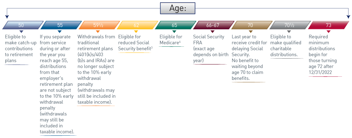 The graph represents a timeline of ages, starting with age 50 and going through age 73, and the benefits a person becomes eligible when he or she reaches that ages.